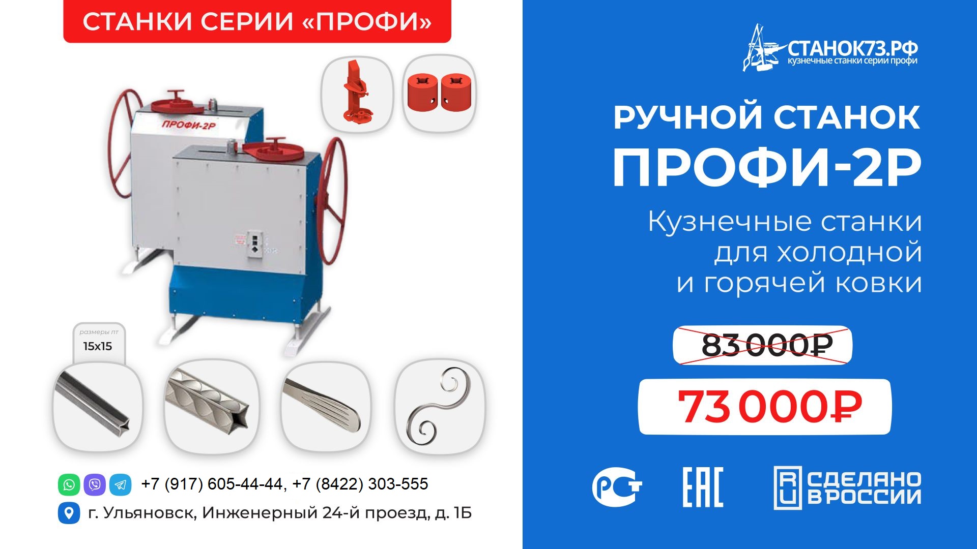 ООО «Компания ПРОФИ» серийно выпускает и предлагает купить кузнечные станки «ПРОФИ-2Р», с (механическим) ручным приводом через редуктор, по выгодной цене. Оборудование предназначено для выполнения большого количества операций по технологии «холодной или горячей» ковки, с его помощью можно осуществлять: